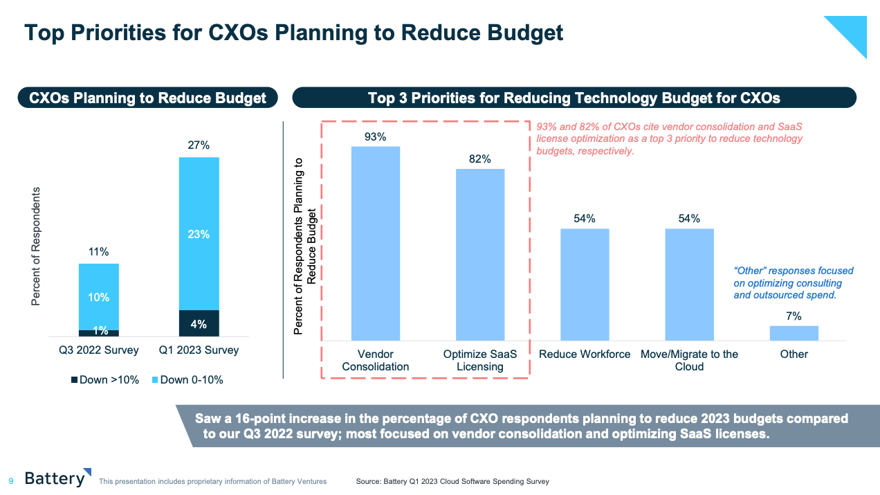 In Battery Ventures Q1 2023 Cloud Software Spending Survey the top two priorities for CXOs to reduce technology spend were: